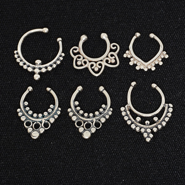 • JOIAS, seis (6) piercing para nariz, confeccionados em PRATA, modelos variados, peso total aproximado 3,6 gr.,vide foto.