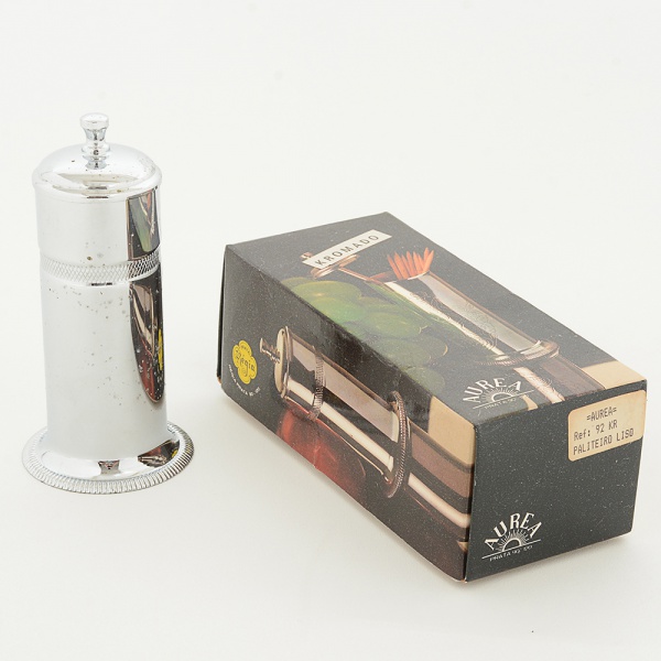 • METAL CROMADO, um (1) paliteiro na caixa e sem uso, com duas marcas ÁUREA e RÉGIA (talvez a mesmamanufatura utilizasse as duas marcas), cilíndrico, ornado com serrilhados, medindo 10,5 cm altura, vide foto.