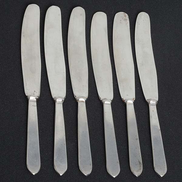 • FAQUEIRO, seis (6) facas de serviço, confeccionadas em aço inox, sem marca de manufatura aparente, medindo22 cm, sinais de uso, vide foto.