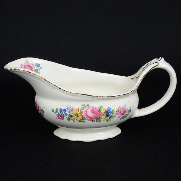 • FAIANÇA INGLESA, uma (1) cremeira, ornamentação floral policromada, arremates com frisos a ouro, marcaWOODS IVORY WARE (usada nas décadas de 30 e 40 pela Wood & Sons, fundada em 1865, funcionou na PotteriesNew Wharf em Trent e mais tarde na Pottery Stanley em Burlem, fechou em 2005), medindo 20 cm comprimento, traz ocraquelê característico do envelhecimento de toda a faiança, sinais de uso, vide foto.