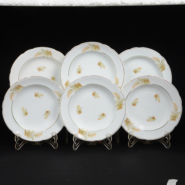 • PORCELANA, seis (6) pratos fundos, ornamentação policromada em elementos vegetalistas, arremates com frisosa ouro, manufatura REAL (Mauá, SP, 1943 a 1994), medindo 23 cm diâmetro, sinais de uso, vide foto.