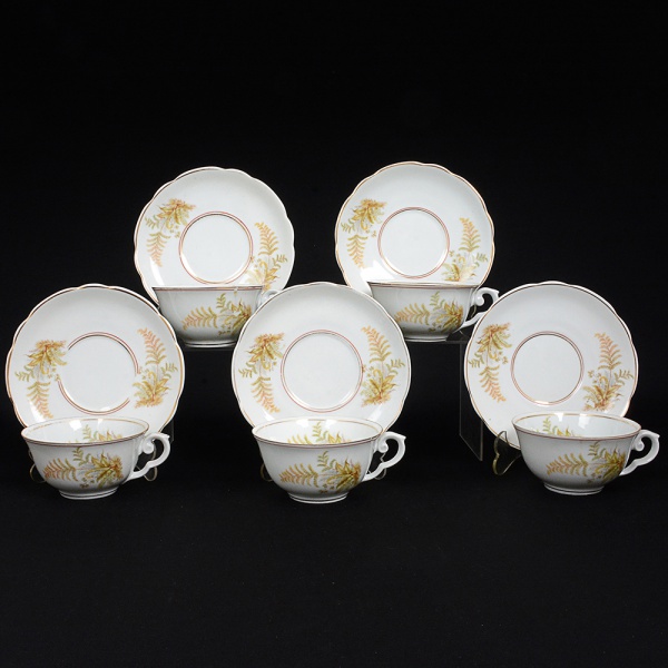 • PORCELANA, cinco (5) xícaras para chá, ornamentação policromada em elementos vegetalistas, arremates comfrisos a ouro, manufatura REAL (Mauá, SP, 1943 a 1994), uma bicada e outra quebrada e colada, sinais de uso, videfoto.