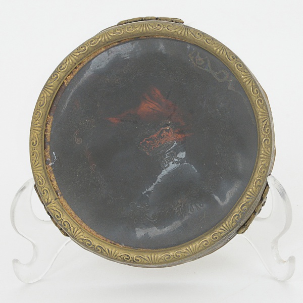 • DIVERSOS, uma (1) base, comemorativa a Coroação da Rainha Elizabeth II, ano 1952, confeccionada emimitação de tortoise, envidraçada, monture em metal relevada em elementos vegetalistas, base trípode em volutas,medindo 8,5 cm diâmetro, sinais de uso, vide foto.
