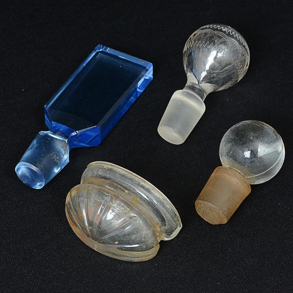• VIDRO, quatro (4) itens: 1 porta água benta e 3 tampas, distintas, translúcidos, três incolores e um azul, medindo amaior peça 9 cm, sinais de uso, vide foto.