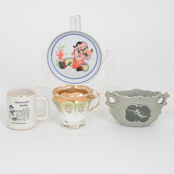 • PORCELANA E BISCUIT, quatro (4) itens: 1 porta copo representando criança oriental, policromado, medindo7,5 cm diâmetro; 1 antiga xícara para café sem o pires, ornada em degrade do verde ao branco, generosos arremates aouro já com sinais de desgastes, sem marca de manufatura aparente; 1 canequinha com propaganda da ChurrascariaJardim, Copacabana, Rio; 1 pequeno vaso floreiro em jaspe, tons de verde e branco, medindo 8 cm, rachado próximodas alças, todos os itens com sinais de uso, vide foto.