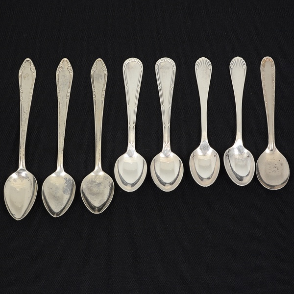 • METAL PRATEADO, oito (8) colheres para café de quatro modelos distintos e marcas variadas: 2 CHRISTOFLE;1 ELO; 3 WOLFF e 2 VIX, medindo em média 10 cm, todas com sinais de uso, vide foto.