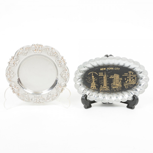 • METAL PRATEADO, dois (2) itens distintos: 1 porta copos, confeccionado em aço inox, borda relevada em rosase volutas, medindo 10,5 cm diâmetro; 1 pequena travessa oval, borda canelada, ornamentação central com pontosturísticos de New York, confeccionada em folha de flandres, medindo 12,5 x 7,5 cm, ambos com sinais de uso, videfoto.