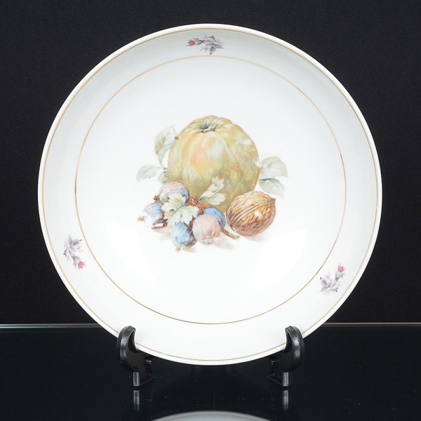 • PORCELANA, uma (1) saladeira com ornamentação policromada representando frutas, arremates com frisosdourados, manufatura SCHMIDT (Pomerode, SC; Mauá, SP; Campo Largo, PR, fundada em 1945, ainda em atividade,maior fábrica de porcelana da América Latina), bicado na base, medindo 24,5 cm diâmetro e 6 cm altura, sinais de uso,vide foto.