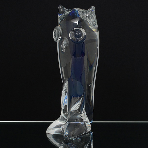 • ESCULTURA, uma (1) representando coruja, incolor e translúcida com sulfito interno na tonalidade azul, assinadaem acidado KRISTALUXUS, medindo 25,5 cm altura, vide foto.