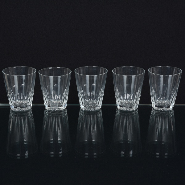 • DEMI CRISTAL, cinco (5) copos, incolores e translúcidos, ligeiramente obcônicos, moldado em dedão, fundoestrelado, medindo 6 cm diâmetro e 7,5 cm altura, sinais de uso, vide foto.