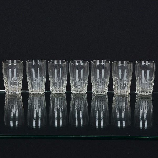 • VIDRO, sete (7) copos, incolores e translúcidos, quase cilíndricos, metade inferior lapidada em sulcos verticais ehorizontais, medindo 4,5 cm diâmetro e 7 cm altura, sinais de uso, vide foto.