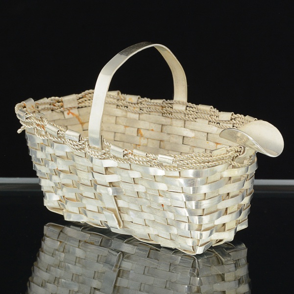 • METAL PRATEADO, um (1) cinzeiro no formato de cesta, confeccionado em tresse de fitilhos em metal earamado, medindo 7,5 cm comprimento, vide foto.