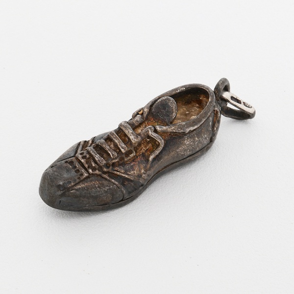 • JOIA, um (1) pingente no formato de chuteira, confeccionado em PRATA, contrastado 925 milésimos, medindo 4 cm mais olhal e argola, peso 14,1 gr., sinais de uso, vide foto.