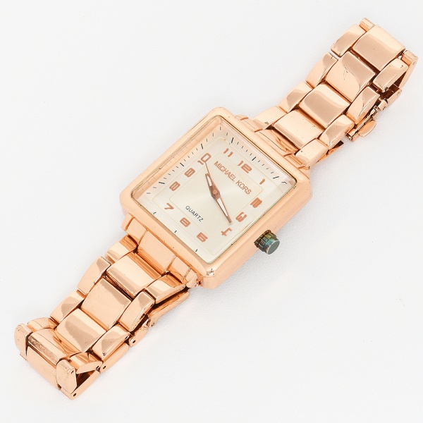 • RELÓGIO, um (1) de pulso, marca MICHAEL KORS (Karl Anderson Jr.; 1959, Long Island, USA; estilista Norte Americano; estudou Fashion Design no Fashion Institute of Technology em New York; em 1981 fundou a marca Michael Kors, marca distribuída no Brasil pela Technos), mostrador com algarismos arábicos, caixa e pulseira em metal na tonalidade ouro avermelhada, movimento quartz, medindo 36 x 36 mm, usado, não testado e sem garantia, vide foto.