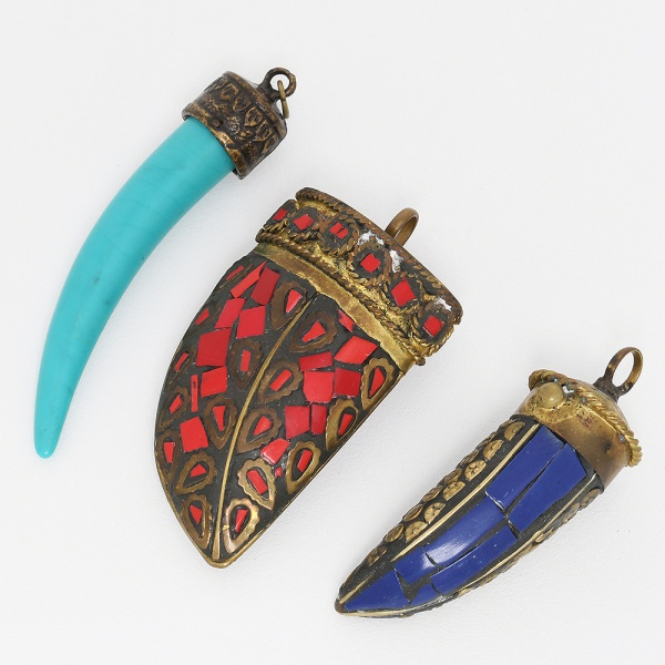 • BIJUTERIAS ORIENTAIS, três (3) pingentes com apliques confeccionados em materiais diversos, todos representando presas, medindo o maior 7,5 cm, sinais de uso, vide foto.