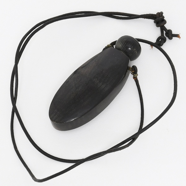• BIJUTERIA, um (1) frasco pingente, entalhado em chifre, tampa rosqueável, medindo 8,5 cm, cordoamento em couro, sinais de uso, vide foto.