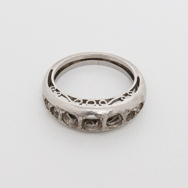 • JOIA, um (1) anel em PLATINA, faltando as pedras, peso aproximado 5,1 gr., vide foto.