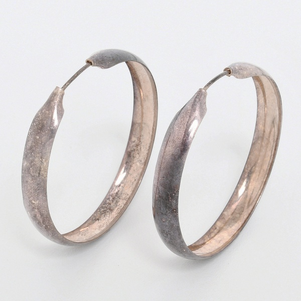 • JOIAS, par (2) brincos de argolas, meia cana, para orelha furada, confeccionados em PRATA, medindo 5 cm diâmetro, peso total 11,7 gr., sinais de uso, vide foto.