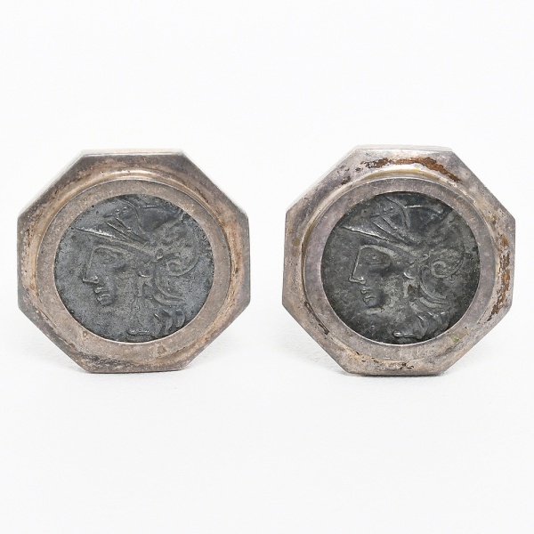 • JOIAS, par (2) brincos de pressão, com imitações de moedas greco/romanas, monture octogonal em PRATA, medindo 22 x 22 mm, peso total aproximado 12,5 gr., sinais de uso, vide foto.