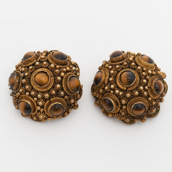 • JOIA, par (2) brincos de pressão, confeccionados em PRATA dourada, trabalho em filigrana, cravações em cabochões de olho de tigre, medindo 22 mm diâmetro, peso 13,8 gr.