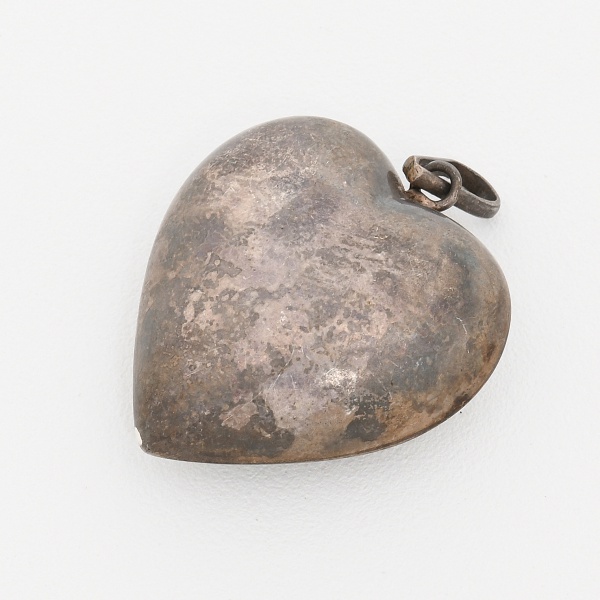 • JOIA, um (1) pingente no formato de coração, confeccionado em PRATA, medindo 3,5 cm mais olhal e argola, peso 8,4 gr., sinais de uso, vide foto.