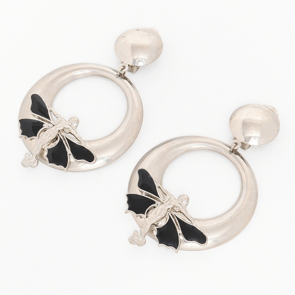 • BIJUTERIAS, par (2) brincos de pressão, representando mulher alada, confeccionados em aço com esmaltação, padrão Art Nouveau, medindo 8 cm, sinais de uso, vide foto.