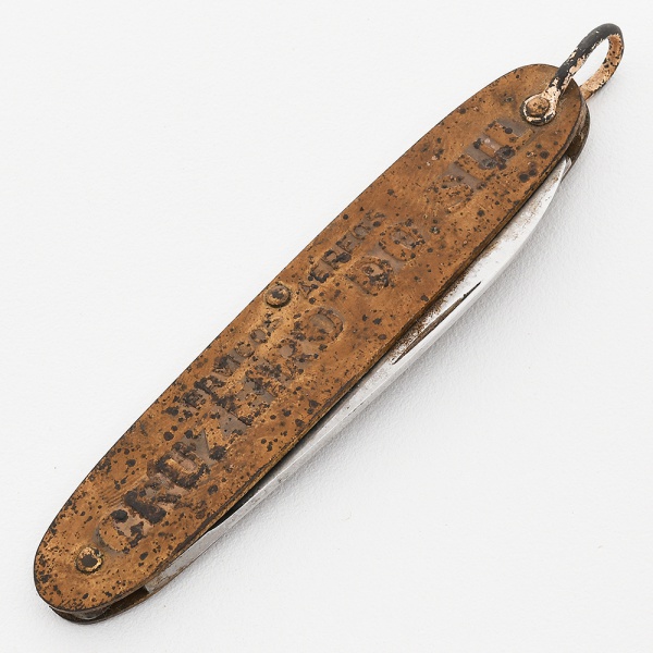 • CUTELARIA, um (1) canivete com duas lâminas em aço inox, marca MAEL, propaganda da Serviços Aéreos Cruzeiro do Sul, corpo em bronze, medindo fechado 8,5 cm, sinais de uso, vide foto.