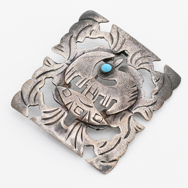 • JOIA, um (1) broche confeccionado em PRATA, vazado, representando pássaro, contrastado 925 milésimos, origem Cuzco, medindo 37 x 32 mm, peso 6,5 gr., sinais de uso, vide foto.