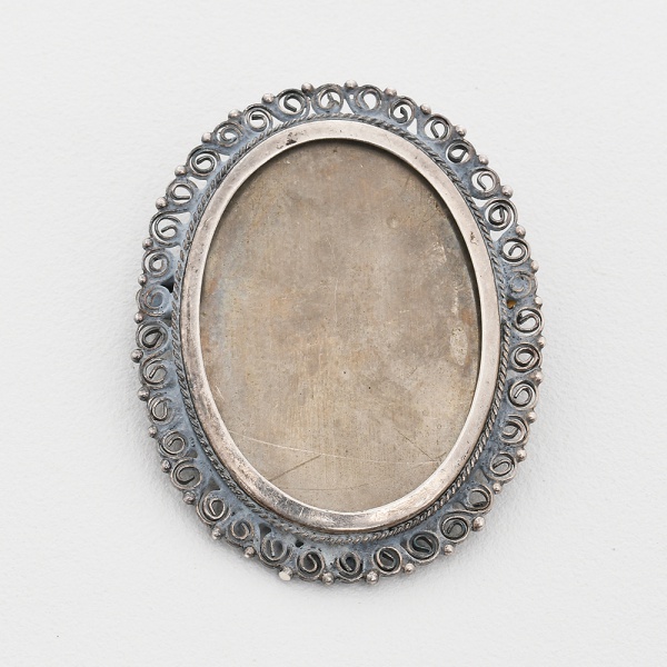 • JOIA, um (1) broche/pingente oval, confeccionado em PRATA, contrastado 800 milésimos, borda filigranada, medindo 42 x 33 mm, peso 5,7 gr., sinais de uso, vide foto.