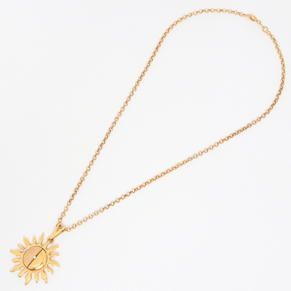 • BIJUTERIA, uma (1) gargantilha confeccionada em metal dourado, fecho do tipo boia, medindo 41 cm comprimento, acompanha pingente no formato de sol com cravação de pedra abrilhantada, sinais de uso, vide foto.
