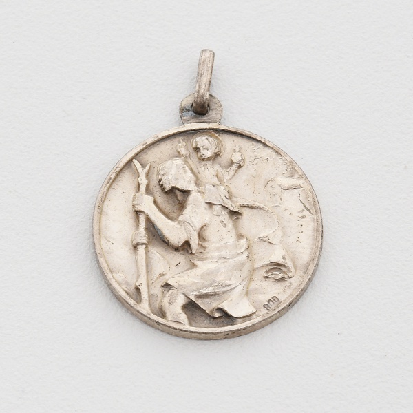• NUMISMÁTICA, uma (1) medalha em PRATA italiana, contrastada 800 milésimos, anverso representando São Cristóvão, reverso representando Papa Paulo VI, medindo 21 mm diâmetro mais olhal e argola, peso aproximado 5,3 gr., sinais de uso, vide foto.