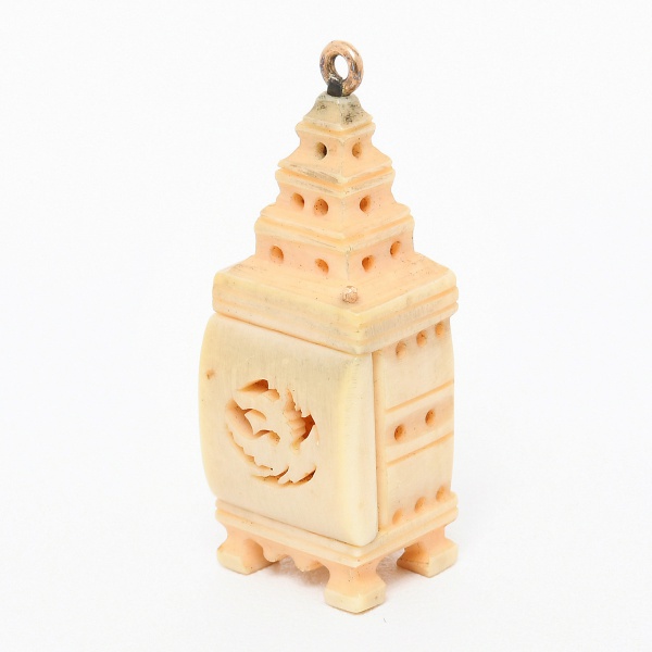 • JOIA, um (1) pingente entalhado em marfim, representando oratório com portinhola, monture em metal dourado, medindo 3 cm altura mais olhal, vide foto.