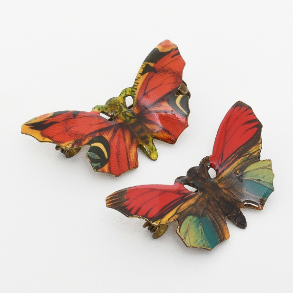 • BIJUTERIAS, par (2) broches em metal com esmaltação policromada, representando borboletas, medindo 4,5 x 2,5 cm, sinais de uso, vide foto.