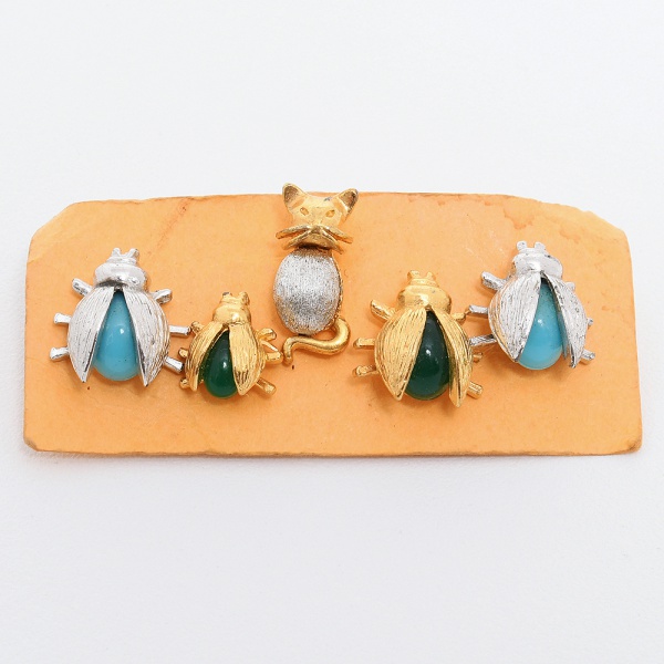 • BIJUTERIAS, cinco (5) pins em metal prateado e dourado, representando gato e joaninhas, não aparentam uso, medindo em média 1 cm, possuem apliques, vide foto.