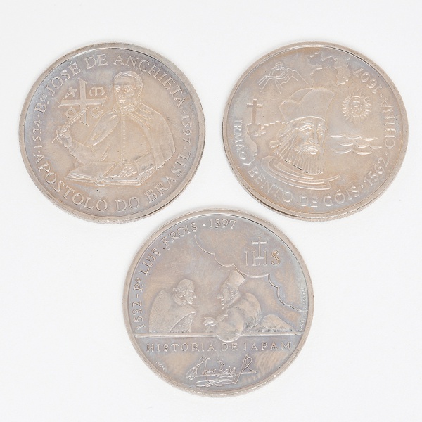 • NUMISMÁTICA, Portugal, três (3) moedas comemorativas de 200 escudos, cunhadas em CuNi, sendo: José de Anchieta, Apostolo do Brasil 1997; Historia de Japam 1997 e Irmão Bento de Góis, China 1997, todas em excelente estado de conservação, vide foto