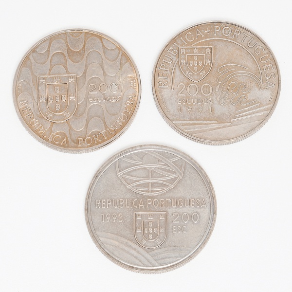 • NUMISMÁTICA, Portugal, três (3) moedas comemorativas de 200 escudos, cunhadas em CuNi, sendo: Colombo e Portugal 1991; Presidência da Comunidade Europeia 1992 e Espingarda 1993, todas em excelente estado de conservação, vide foto.