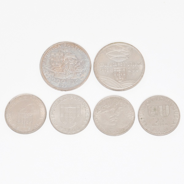 • NUMISMÁTICA, Portugal, seis (6) moedas comemorativas, cunhadas em CuNi, sendo: 4 de 25 escudos: Ano Internacional do Deficiente 1981; Ano I Criança 1979; Democracia e Liberdade 1984 e Região Autônoma Madeira 1981; 2 de 200 escudos: espingarda 1993 e S. Francisco Xavier 1997, todas em excelente estado de conservação, vide foto.