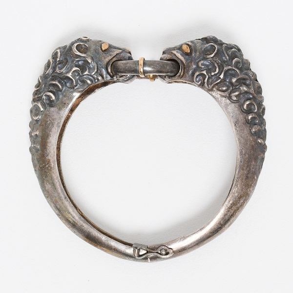 • JOIA, um (1) bracelete em PRATA, representando cabeças leoninas, detalhes em dourado, medida interna aproximada 5 cm diâmetro, peso 58,7 gr., vide foto.