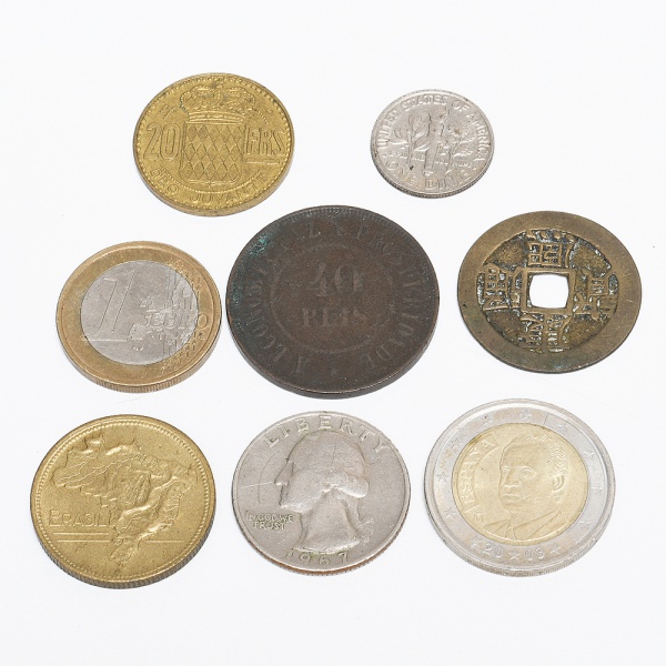 • NUMISMÁTICA, oito (8) moedas, nacionais e estrangeiras: 1 de 40 reis 1909, cunhada em bronze, Brasil, BC; 1 de 2 cruzeiros 1942, cunhada em Br-Al, DATA ESCASSA, Brasil, MBC/S; 2 de 1 e 2 euros, bimetálicas, EUROPA, ainda correntes (câmbio); 2 de 10 cents e 25 cents, em Cu-Ni, USA, ainda correntes (câmbio); 1 de 20 francosd 1950, Mônaco, MBC/S; 1 cash, bronze, CHINA, possivelmente cópia, todas circuladas, vide foto.