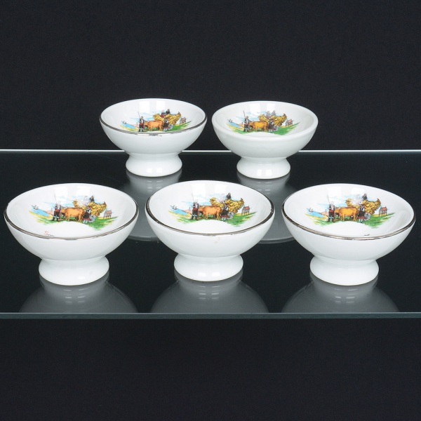 • PORCELANA, cinco (5) taças para sobremesa, ornamentação policromada representando paisagem com marina e cena rural, todas com dizeres distintos em espanhol, borda com friso prateado, sem marca de manufatura aparente, medindo 10 cm diâmetro e 5,5 cm altura, sinais de uso, vide foto.