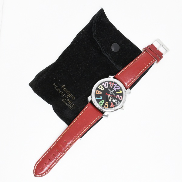 • RELÓGIO, um (1) de pulso, marca MONTE CARLO (marca criada em 1981 no Rio de Janeiro pelos irmãos Vicente e Armando Balbi, quando abriram a sua primeira loja), movimento quartz, mostrador preto com algarismos arábicos coloridos, caixa em aço, medindo 48 mm diâmetro, modelo FIORE MC 8166, pulseira em couro legítimo com sinais de desgastes, usado, funcionando e sem garantia, acondicionado na capa maleável original da marca, vide foto.