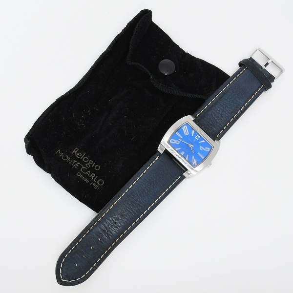 • RELÓGIO, um (1) de pulso, marca MONTE CARLO (marca criada em 1981 no Rio de Janeiro pelos irmãos Vicente e Armando Balbi, quando abriram a sua primeira loja), movimento quartz, mostrador azul com algarismos arábicos, caixa em aço, medindo 40 x 30 mm, pulseira em couro legítimo com sinais de desgastes, usado, funcionando e sem garantia, acondicionado na capa maleável original da marca, vide foto.