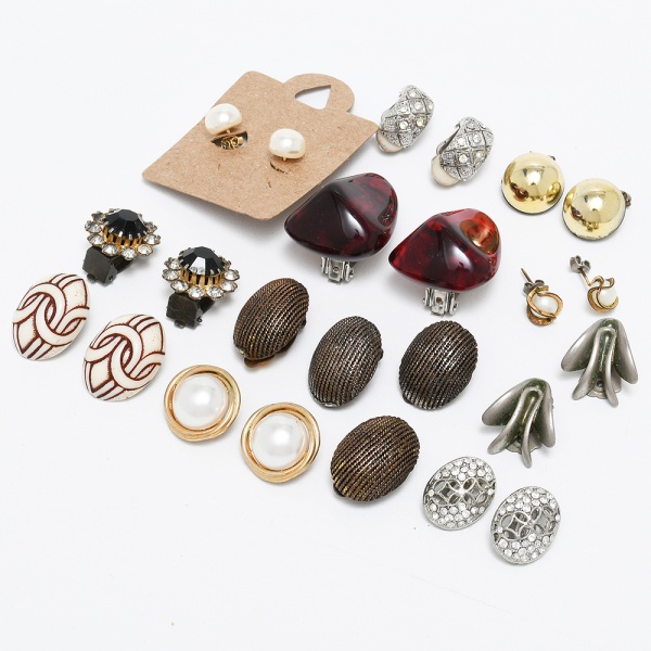 • BIJUTERIAS, doze (12) pares de brincos, modelos diversos, confeccionados em materiais variados, todos com sinais de uso, vide foto.