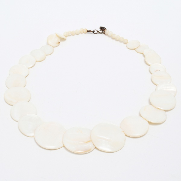 • BIJUTERIA, uma (1) gargantilha, confeccionada em discos de madrepérola, dispostos em degrade, além de contas esféricas do mesmo material, monture em metal com sinais de oxidação, fecho do tipo lobster, medindo aproximadamente 44 cm comprimento, sinais de uso, vide foto.