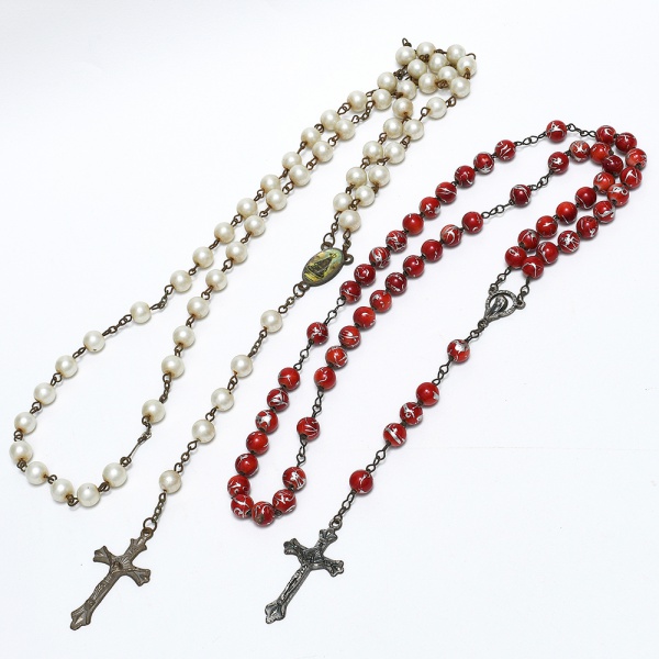 • ARTE SACRA, dois (2) antigos terços distintos: 1 com contas em polímero, pintadas na tonalidade vermelha com mesclados prateados, cruz e monture em metal, medindo 44 cm; 1 com contas imitando madrepérola, cruz e monture em metal medindo 57 cm, ambos com sinais de uso, vide foto.