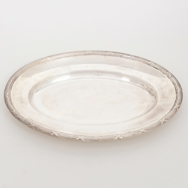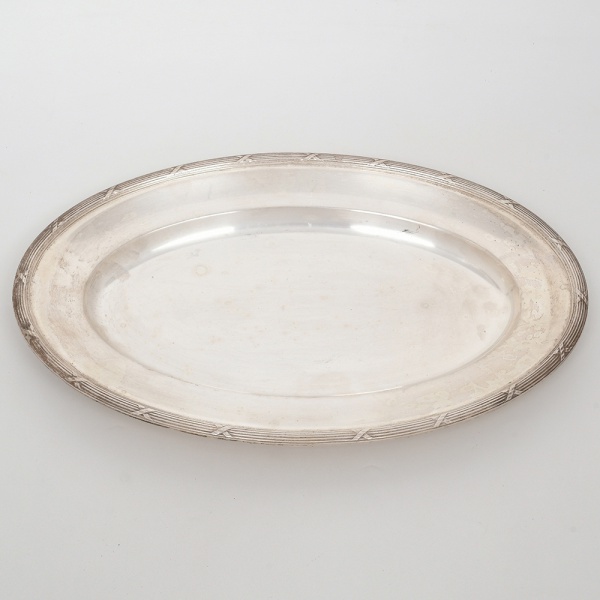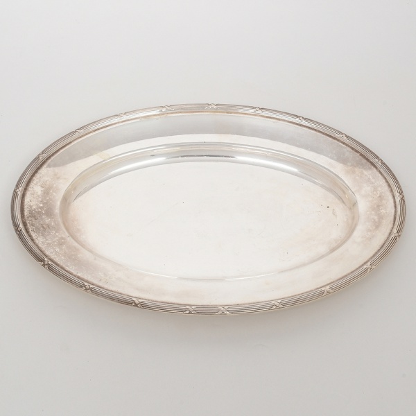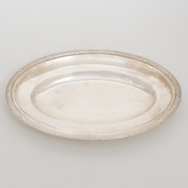 • FRACALANZA. Elegante bandeja confeccionada em metal espessurado à prata, formato oval, centro ligeiramente rebaixado, borda relevada com fileira de frisos intercaladas por fitas cruzadas, ornato obtido através da técnica do cinzelado. Marca da manufatura no verso. Medidas: