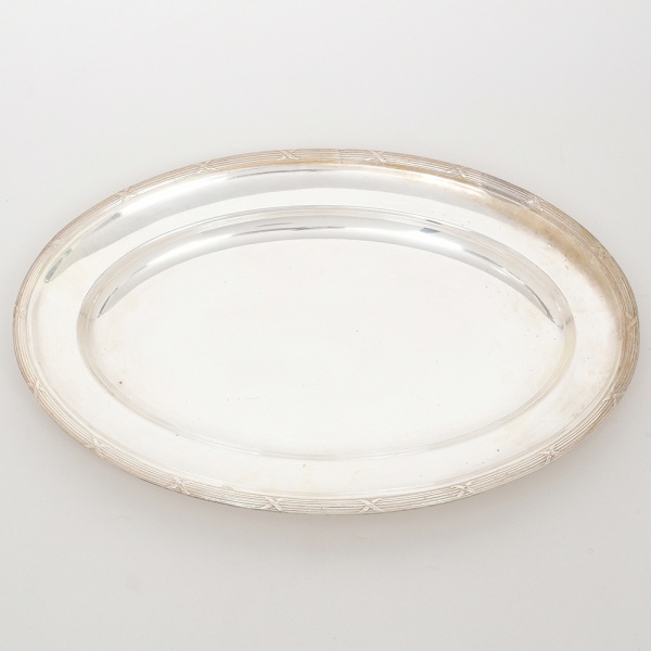 • WOLFF. Elegante bandeja confeccionada em metal espessurado à prata, formato oval, centro ligeiramente rebaixado, borda relevada com fileira de frisos intercaladas por fitas cruzadas, ornato obtido através da técnica do cinzelado. Marca da manufatura no verso. Medidas: