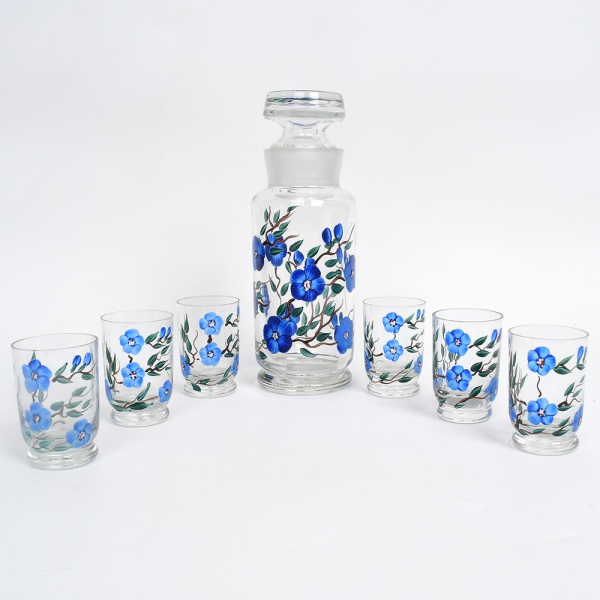 • Conjunto para licor em vidro incolor esmaltado, composto por garrafa com rolha esmerilhada e seis copos, em vidro incolor, com decoração em esmalte policromo representando ramos florais com flores estilizadas em tonalidade azul e folhagem verde. Corpos cilíndricos, base espessada integrada; garrafa com ombros suaves e gargalo com encaixe esmerilhado. Medidas:
