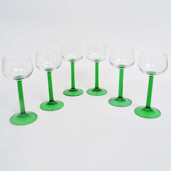 • Conjunto de taças em vidro incolor com haste de tonalidade verde; bojo hemisférico em vidro incolor, com transição para haste cilíndrica em vidro verde translúcido, terminando em base circular no mesmo tom. Composto de seis(06) unidades. Medidas: