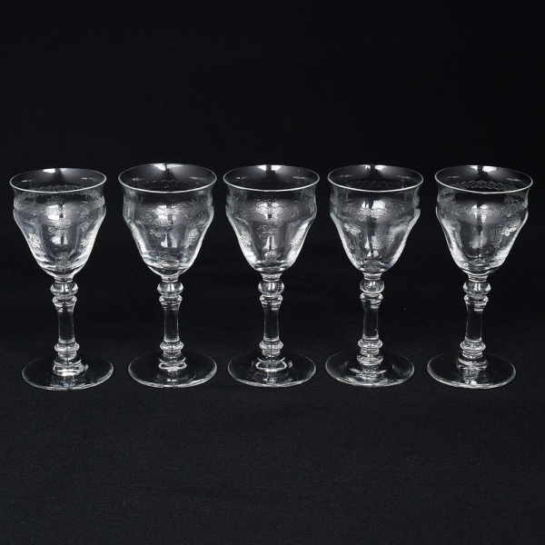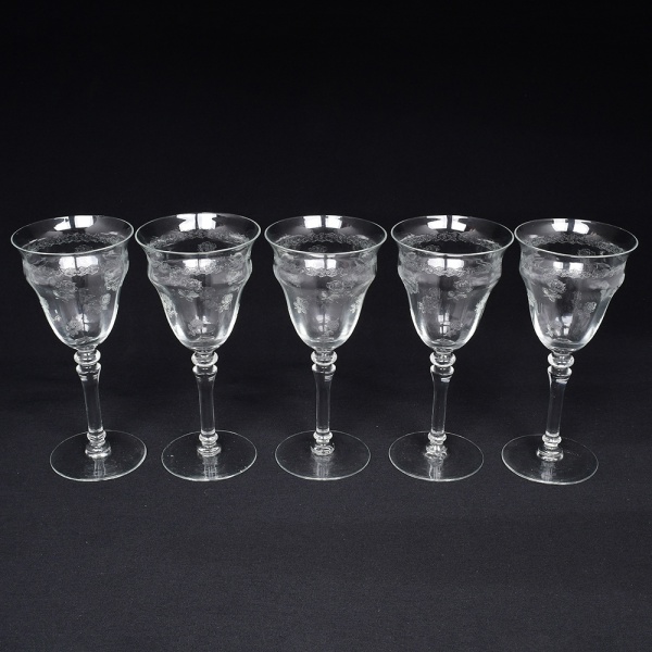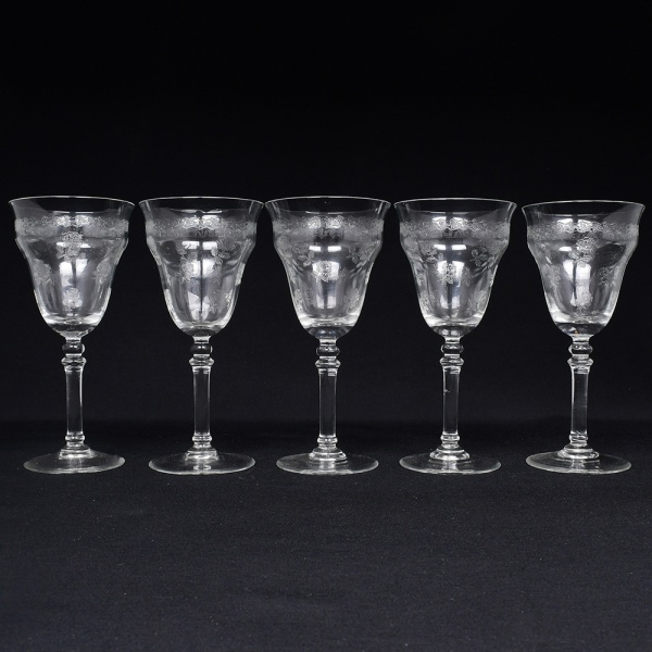 • Belíssimo conjunto de taças de pé alto, para ....., executado em cristal europeu, diáfano e incolor; bojo obcônico, borda ligeiramente evertida, gravado com flores e faixa contínua de motivo vegetalista , haste tubular com anel intermediário e base circular. Composto de cinco(05) unidades. Medidas: Alt.: x Diam.: